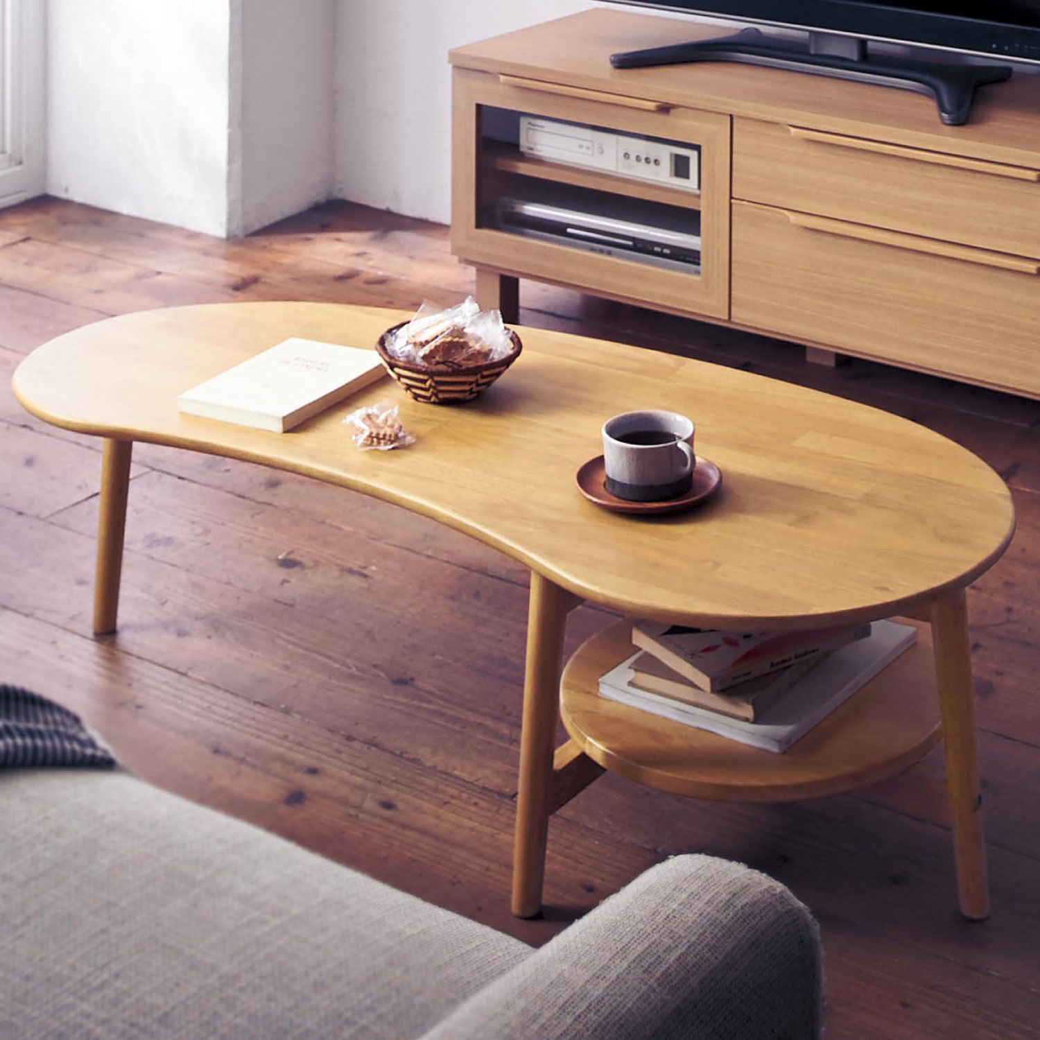 【ベルメゾン】変形型の薄型リビングローテーブル 【奥行も控えめで場所取らず】