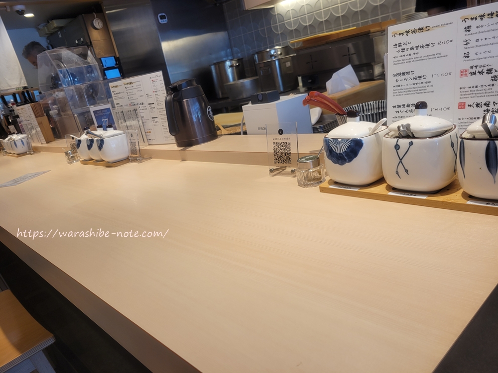 カウンター席だったので、キョロキョロ店員さんを探してタイミングをうかがわなくても、目の前ですぐに気が付いてもらえたので、普通に「お茶漬けお願いします」と言いました。